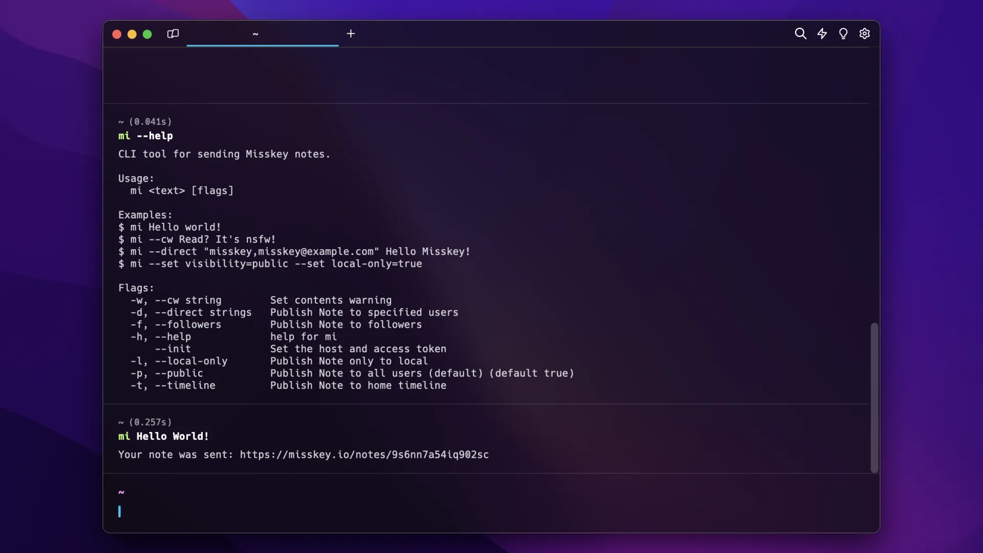 MiCLI から Misskey にノートを投稿するツールRepositoryMisskey 依存症なので常に Misskey を開いてますが、開発している最中でもノートできればいいなーと思い、ターミナル操作のついでにノートできるように開発したものです。 Misskey Go