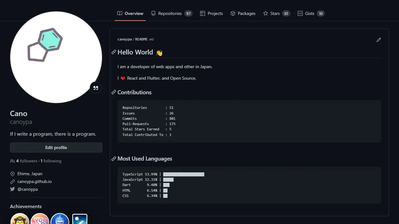 GitHub Readme Stats を使用していましたが、プライベートリポジトリで使用している言語も含めてランキング表示したいなーということと、画像だと少し浮く感じがあったのでテキストで表示したいなー、ということで開発したものです。